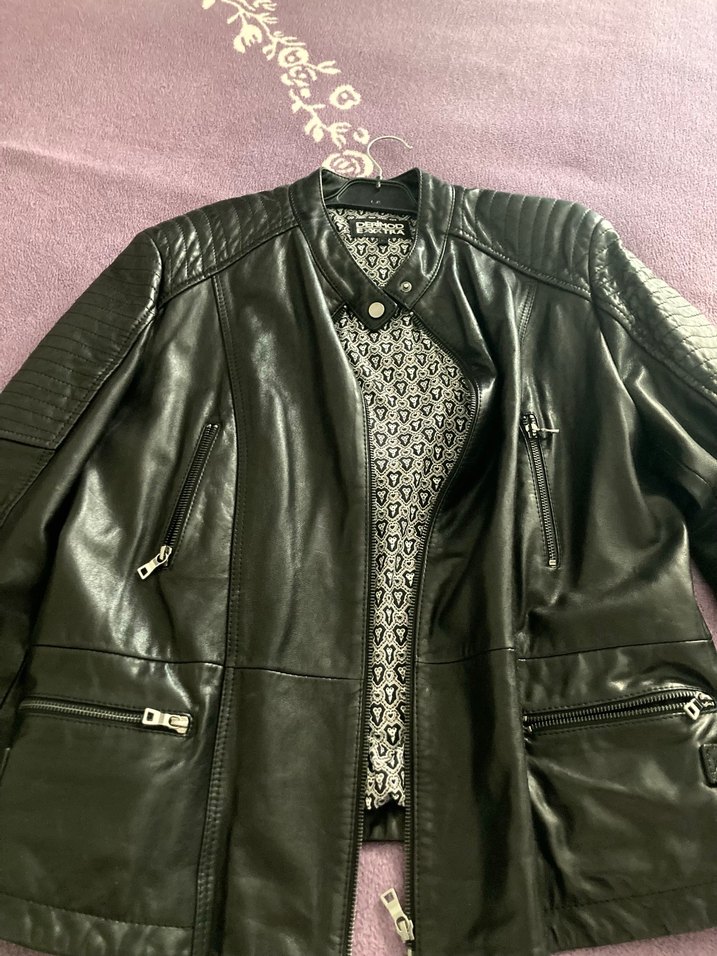 DERİMOD Siyah, fitted deri biker ceket, uzun kollu ve tokalı detaylı. Normal boyda, çıtçıtlı yakalı ve fermuarlı ceplidir. 44 ve 46 Beden için çok uygundur,dört defa giyildi,temiz bakımlı efendim