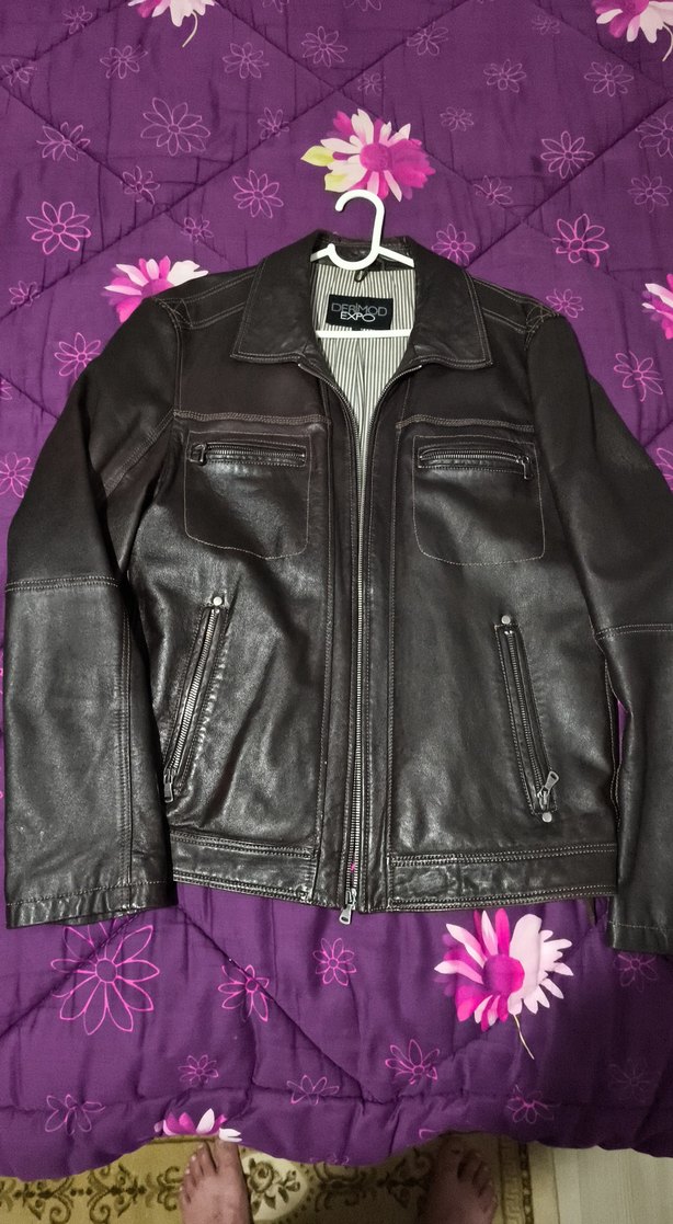Koyu kahverengi deri biker ceket, fermuarlı cepler ve kesik yaka detaylarına sahiptir. Normal boyda, uzun kollu ve rahat kesimdir, günlük sokak stiline uygundur.