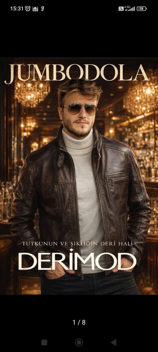Kahverengi deri ceket, yakalı, uzun kollu ve regular kısa kesime sahiptir. Etnik desenli ve parlak görünümlüdür, streetwear tarzına uygundur. DERIMOD markası ve 'TUTKUNUN VE SIKLIGIN DERi HALi' yazısı bulunmaktadır.