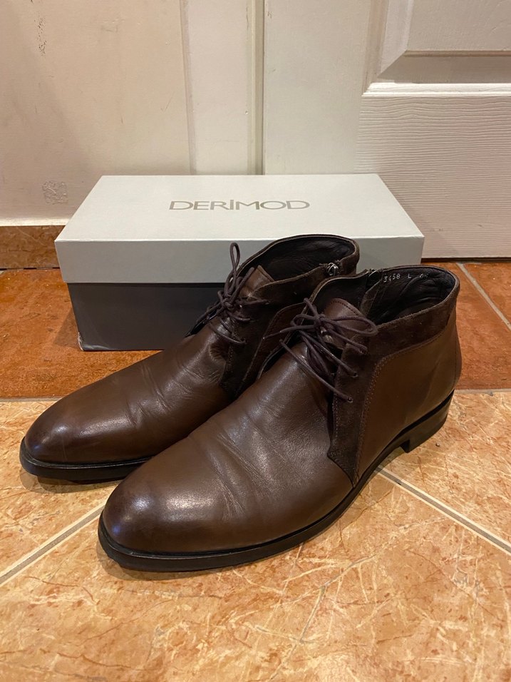 Derimod kahverengi deri erkek bot, kemerli detaylı, desensiz.