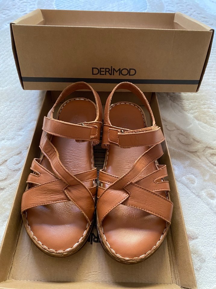 Derimod marka kahverengi deri kadın sandalet, tokalı ve dolgu topuklu, günlük rahat kullanım için uygundur. 37 Numara,hiç giyilmemiştir