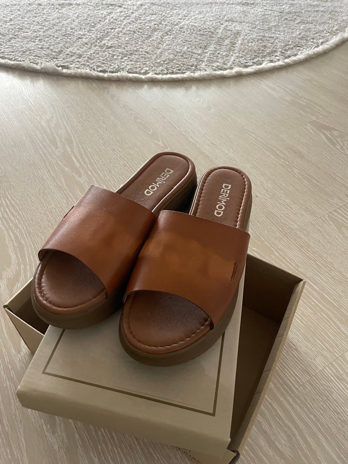 Derimod markalı, parlak kahverengi deri kadın terlikler, platform topuklu ve tokalıdır. Minimalist, desensiz tasarımıyla günlük kullanıma uygundur.