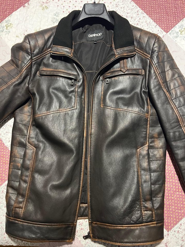 Fermuarlı, kahverengi deri biker ceket, oturan kesim ve kesik yaka ile. Uzun kollu ve normal boyda, günlük rahat kullanıma uygun.
