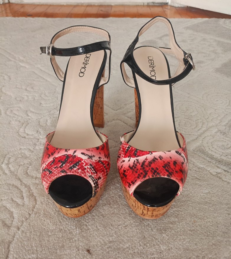 39 numara DERIMOD markalı, tokalı kayışlı ve kauçuk tabanlı kırmızı yılan desenli platform topuklu ayakkabı, romantik akşamlar için uygun. topuk yüksekliği 11.5 cm ürün bir kaç defa giyildi sıfırdan farksızdır.