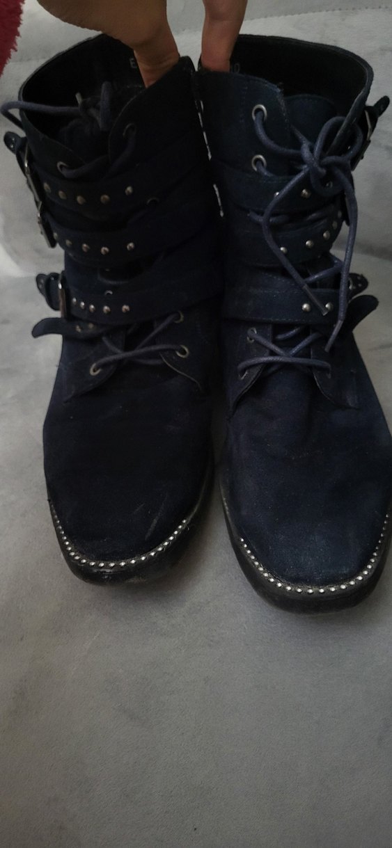 Lacivert süet malzemeden yapılmış, tokalı ve blok topuklu, gotik tarzda kadın botları. Günlük kullanıma uygun rock punk havası taşır.