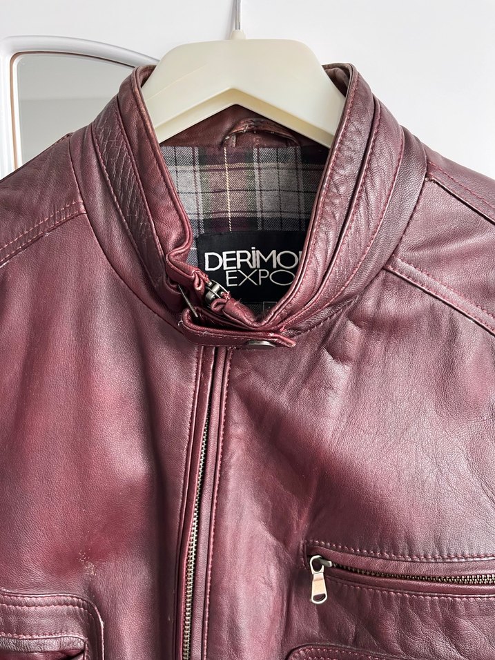 Bordo renkli deri biker ceket, parlak görünümlü, fermuarlı ve yuvarlak yakalıdır. Normal uzunlukta, uzun kollu ve regular fit kesimlidir. Günlük kullanıma uygundur.