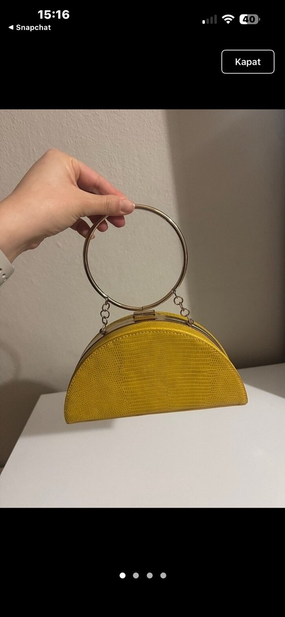 Sarı deri çanta, parlak yılan derisi deseni ve modern klasik tarzıyla. Metal yuvarlak saplı, kemer detaylı, günlük kullanıma uygun.