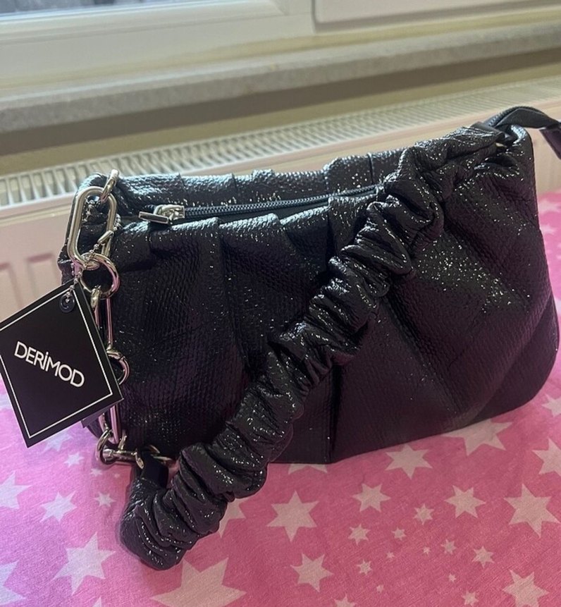 Koyu mor deri çanta, fermuarlı ve yılan deseniyle göz alıcı bir görünüme sahip. Şık ve günlük kullanıma uygun.