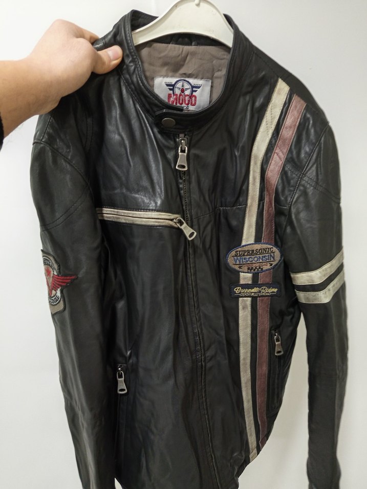 Siyah, dar kesim deri biker ceket, fermuarlı cepler ve yamalarla. Yuvarlak yaka ve uzun kollu, trend bir günlük stil için. ️