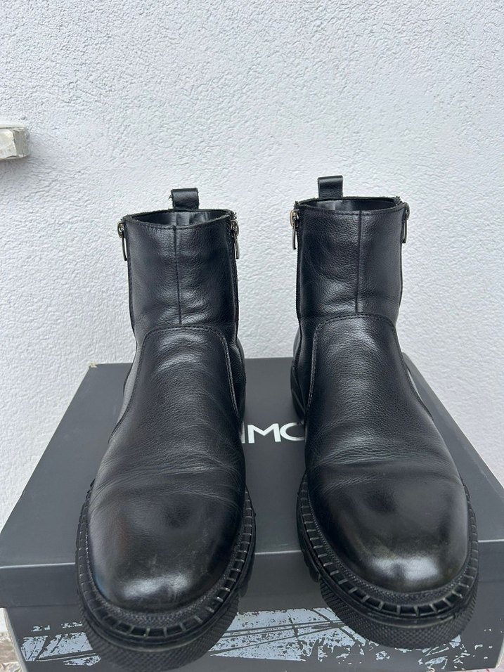 %100 gerçek deri siyah erkek botu. Derimod marka ürün temiz kullanışlıdır sadece arka tarafında deri çatlağı mevcuttur yürümeye bağlı oluşmuş fotoğrafta belirtilmiştir bu sebeple fiyat uygun belirtilmiştir.