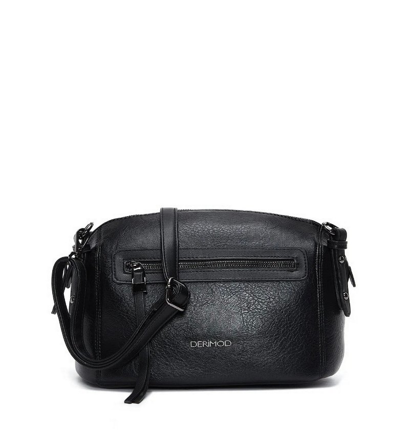Derimod marka siyah deri kadın çanta, kemerli ve minimal biker tarzıyla trendy günlük kullanıma uygun. Hiç kullanılmadı