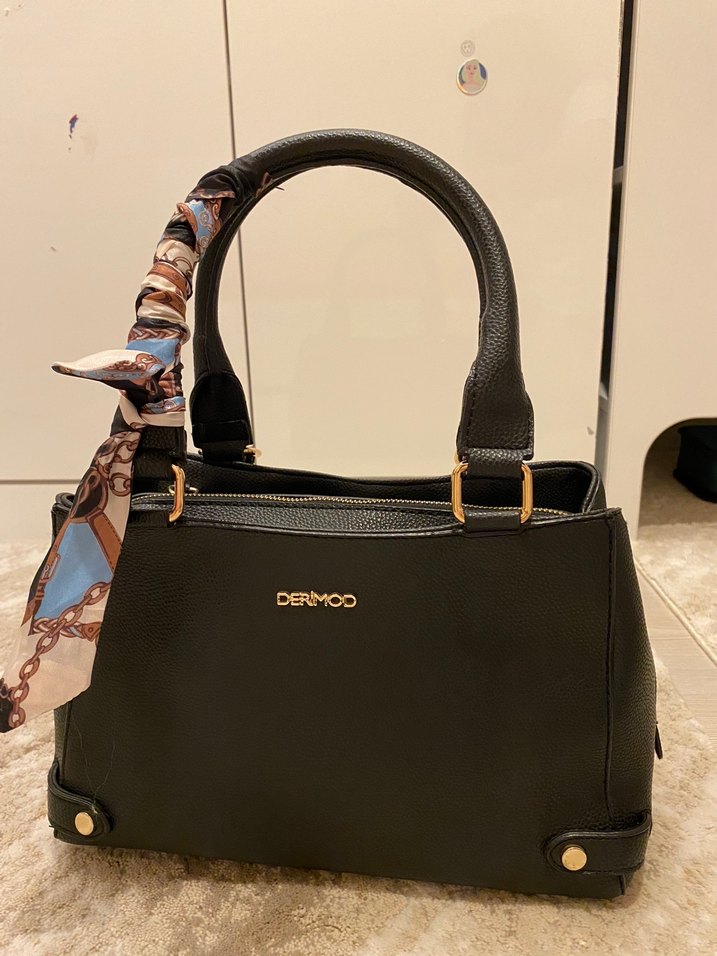 DERIMOD markalı siyah deri çanta, tokalı ve desenli fular detayıyla dikkat çekiyor. Trendy casual sokak stiline uygun.