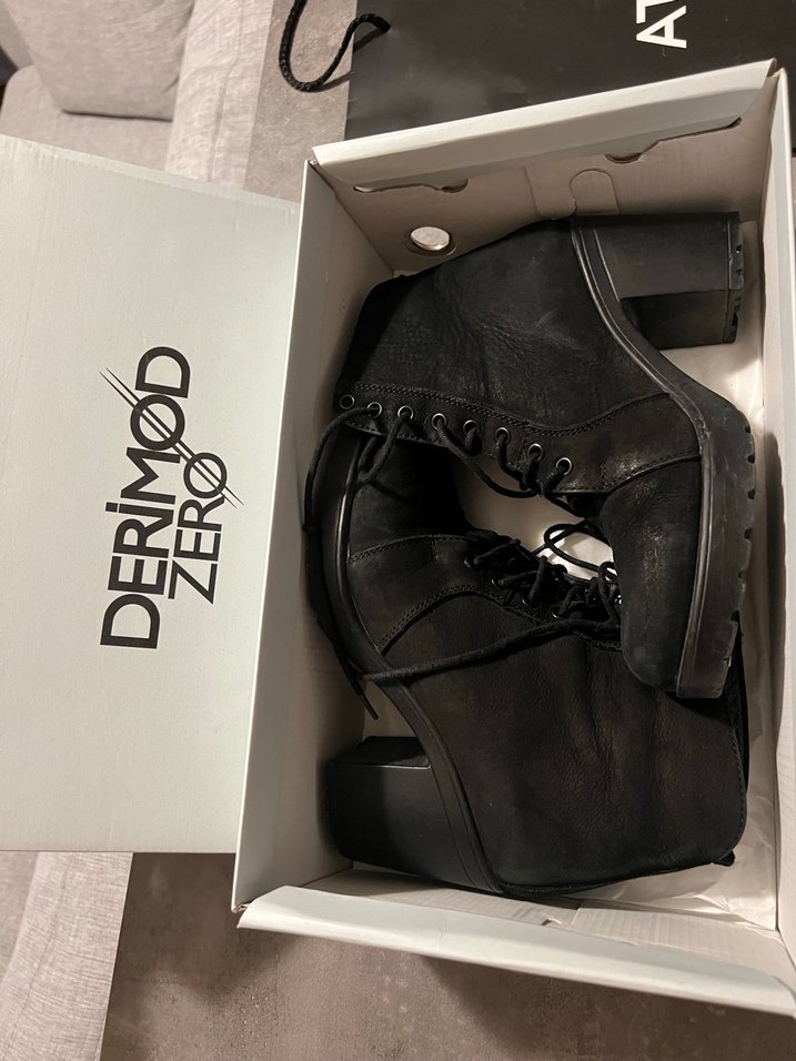 Gerçek deri kullanışlı temiz. Artık giymediğim için satıyorum.Siyah deri, tok topuklu ve tokalı kadın botları. Gotik tarzıyla rock punk havası yaratır.