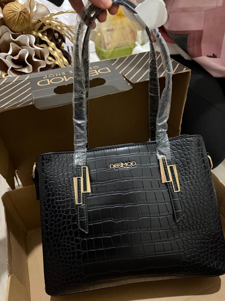 Derimod siyah deri çanta, parlak yılan deseni ve tokalı saplarıyla modern klasik iş şıklığını yansıtıyor. Günlük kullanıma uygun.