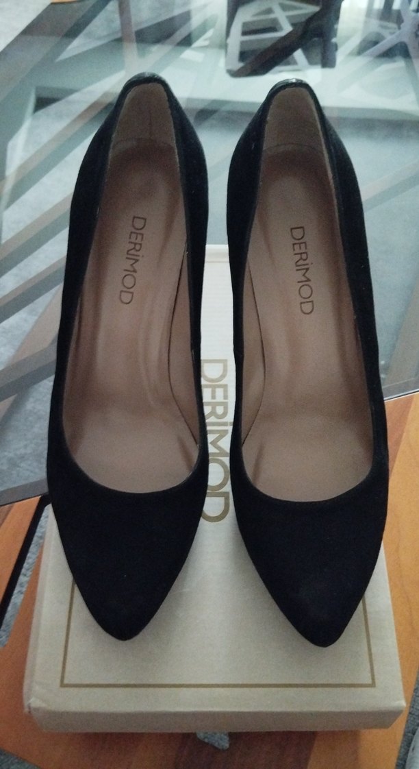 DERIMOD marka siyah süet stiletto topuklu ayakkabılar, desen içermeyen şık tasarımıyla romantik gece buluşmaları için ideal, klasik gotik ve zahmetsiz şıklık sunar. Sadece bir defa giyildi ayakkabı yeni