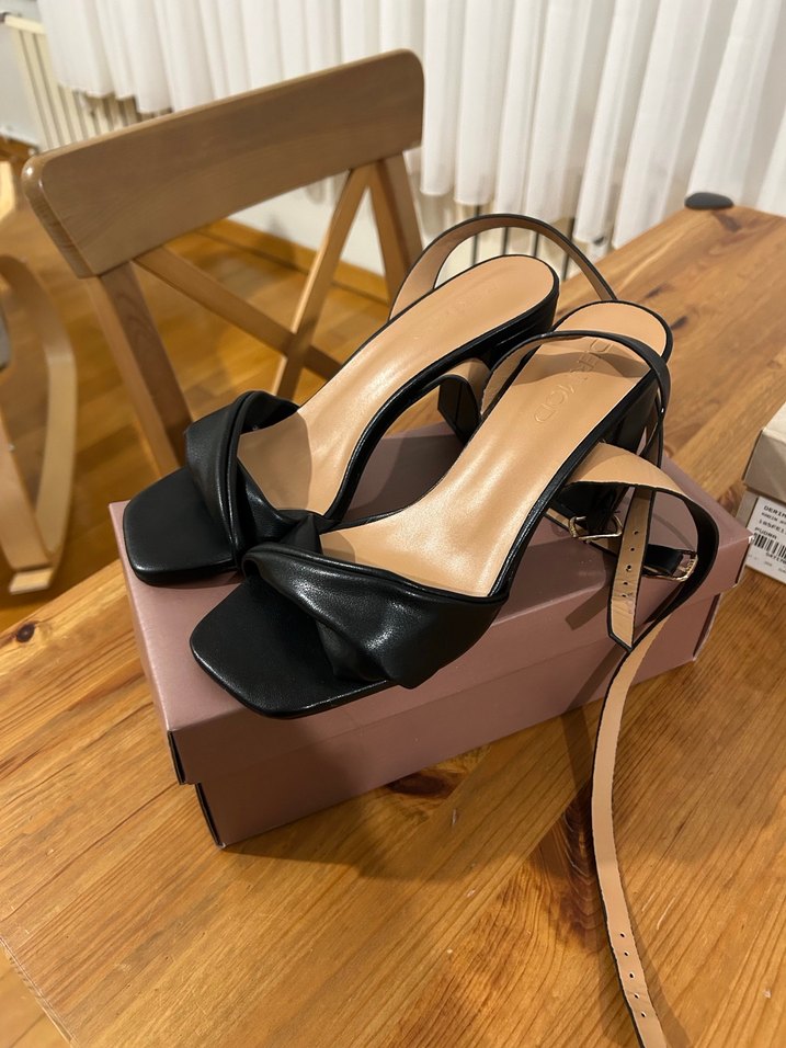 Siyah tokalı bantlı, blok topuklu kadın sandalet. Hiç giyilmedi.