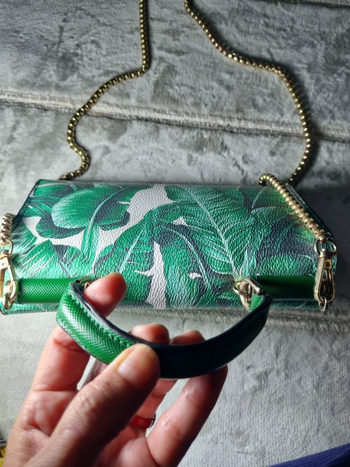 Yeşil desenli, zincir detaylı renkli çanta. Bohem ve avangart tarzda, günlük kullanım için uygun. derimod kusurları fotoda