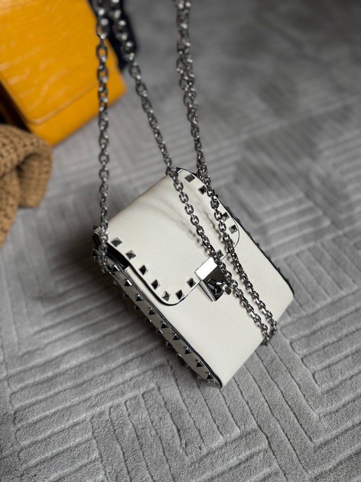 Beyaz deri, yılan desenli ve zincir detaylı bu çanta, rock punk ve Paris tarzını birleştirerek trend ve avangart bir görünüm sunar.