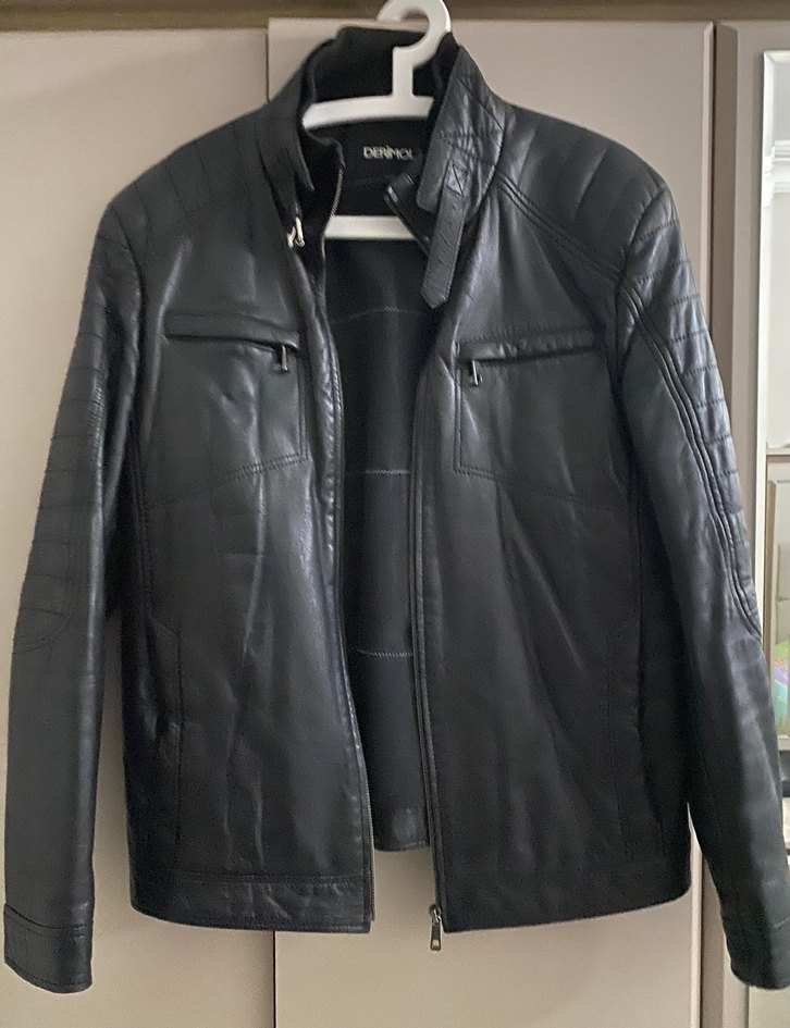 Siyah deri biker ceket, fermuarlı ön ve kesik yaka detaylarıyla günlük kullanıma uygun, normal kesim ve uzun kolludur.