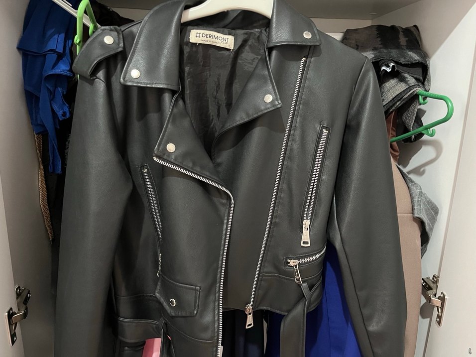 DERIMONT siyah deri biker ceket, kemerli bel ve askılı kollarla. Çentikli yaka ve fermuar detaylarıyla günlük kullanıma uygun şık bir parça.
