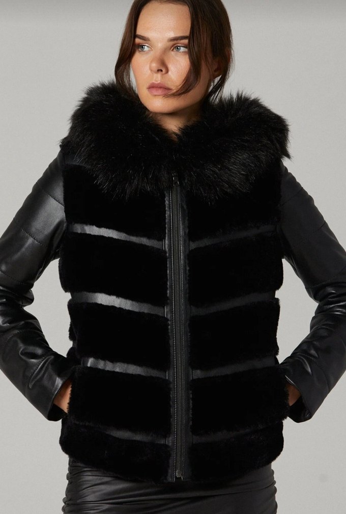 Derimpd,Siyah kapişonu Kürklü Deri Kadın Kışlık Ceket
