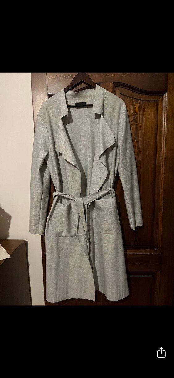 Derin marka.L beden.Gri uzun kalın tok kumaş trenç.Önden iki cepli bel kuşaklı.Sayılı kullandım.Temiz sağlam defosuz