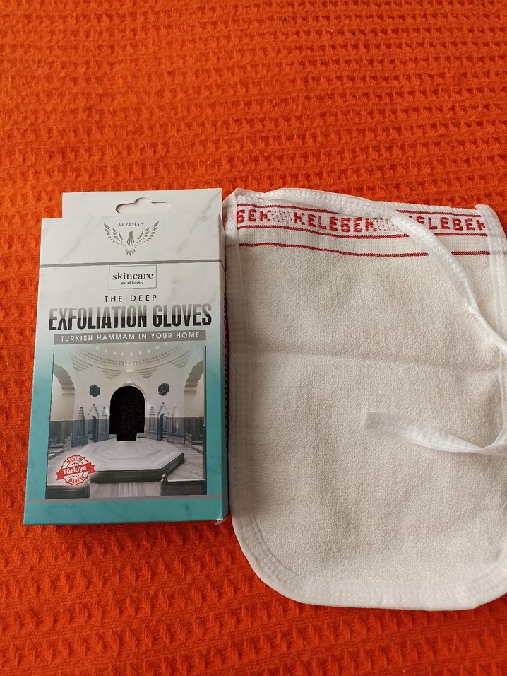 Derin peeling için tasarlanmış Türk hamamı eldiveni ve kenarında kırmızı baskılı beyaz kese içeren set. ♀️