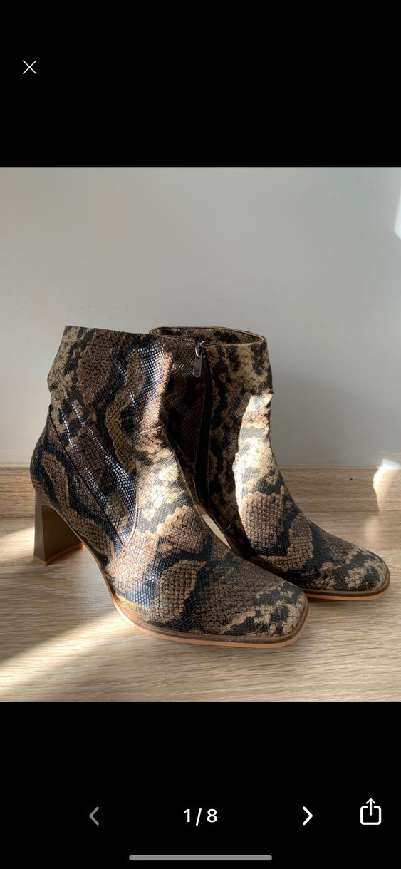 Yılan desenli deri kadın botları, blok topuk ve tokalı detaylarla günlük kullanıma uygundur. Yeni sayılır sorunsuz