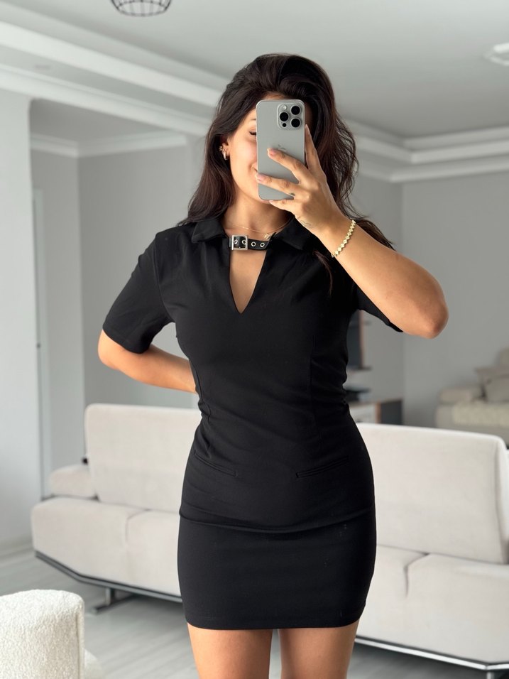 Siyah deri, kısa kollu, yakalı ve bel detaylı mini elbise. Ofis için cesur ve şık bir tercih.