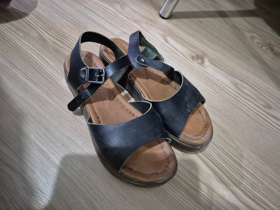 Kahverengi, 36 numara, tokalı kayışlara sahip, deri malzemeden yapılmış kadın sandaletler. Minimalist bohem tarzıyla günlük kullanıma uygundur.