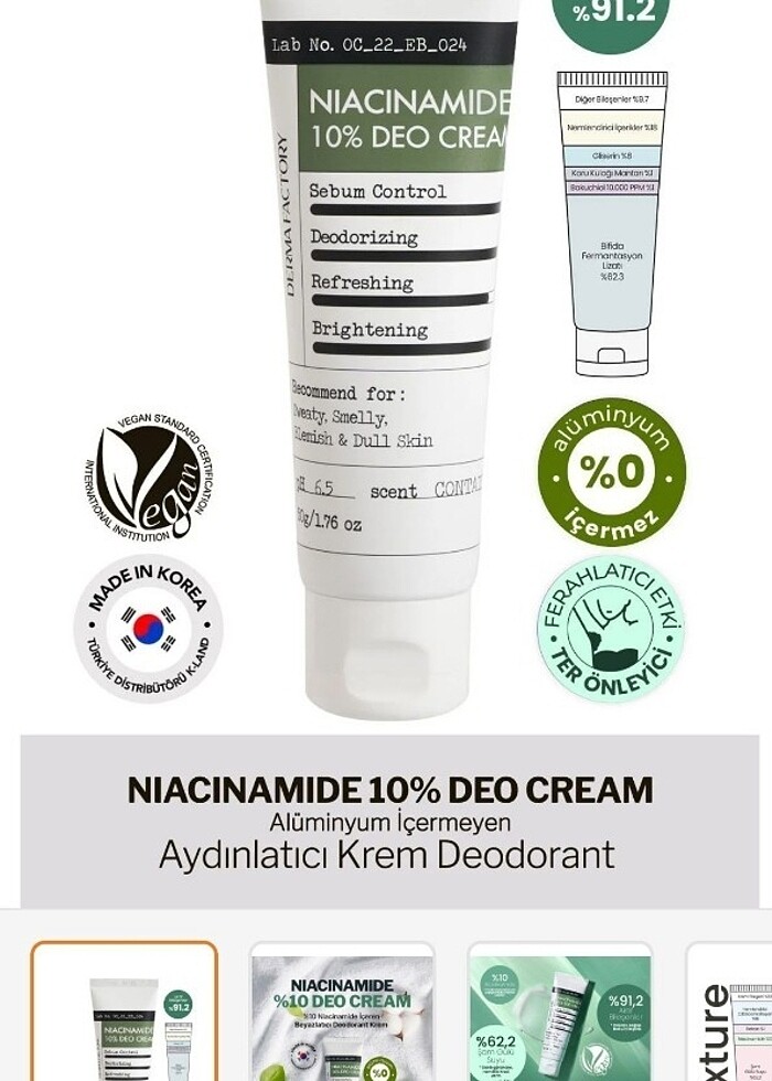 K-LAND den alındı. Derma factory marka niacinamide iceren aydinlatici etkili krem formda deodorant. El ayak yüz icin de kullanilabiliyor temiz.icerikli alüminyum içermeyen bir ürün. 50 gr ürün son kullanma tarihi 2027. Koruma bandi uzerindedir görsellerde detayları mevcut.