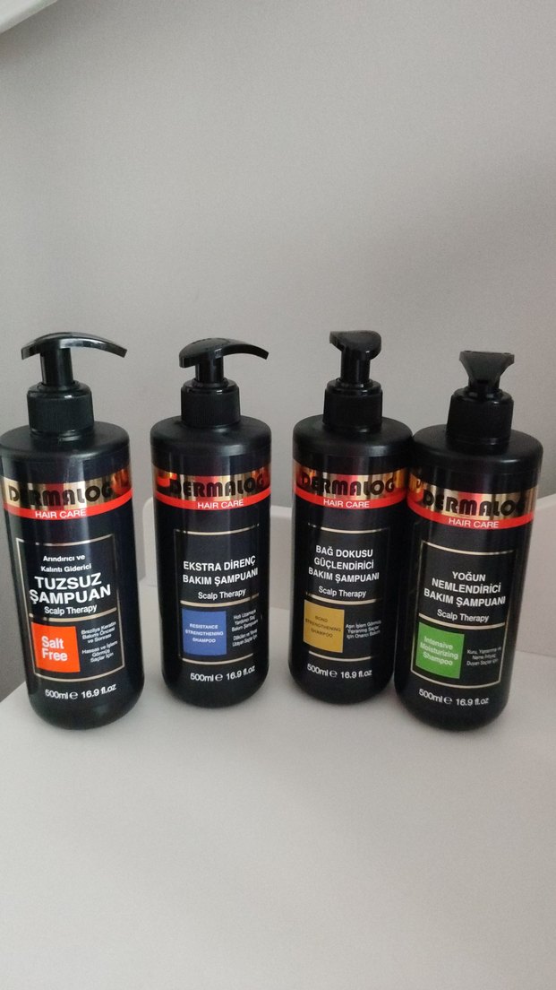 Dermalog saç bakım şampuanları, tuzsuz, ekstra direnç, bağ dokusu güçlendirici ve yoğun nemlendirici özelliklerle 500ml şişelerde sunulur.
