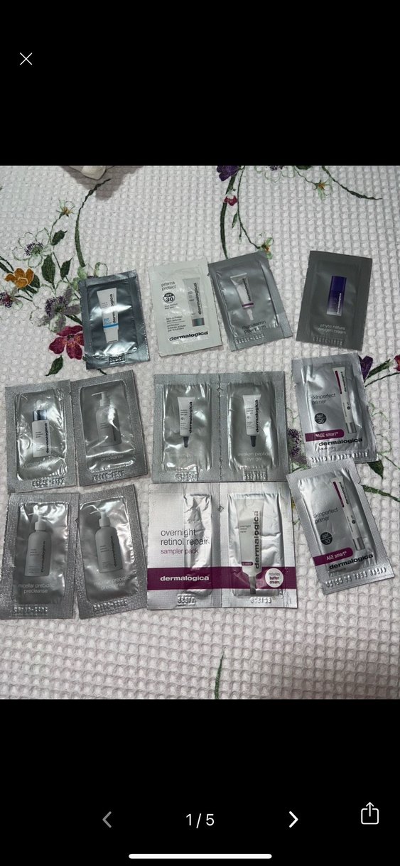Dermalogica markasına ait gece retinol onarıcı ve diğer cilt bakım ürünlerinin örnek paketleri kadınlar için bir arada sunulmuştur.