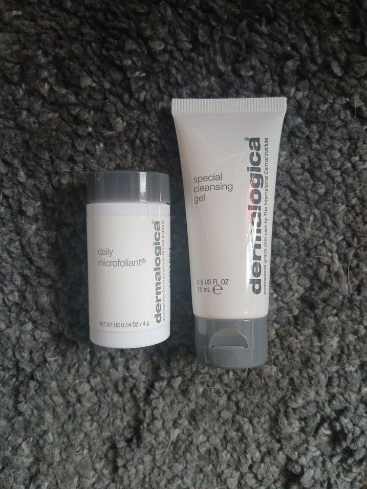 Dermalogica günlük mikrofoliant ve özel temizleyici jel içeren cilt bakım seti.