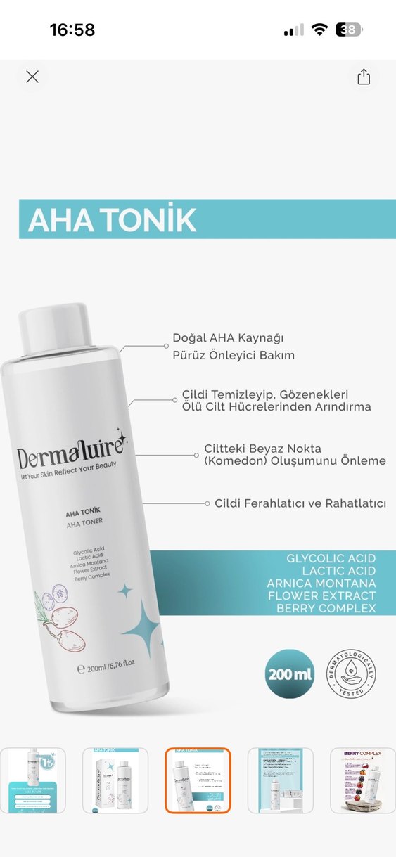 Dermaluire AHA Tonik, doğal AHA kaynağı, glikolik asit, laktik asit, arnica montana, çiçek özü ve berry complex içerir. Cildi temizler, gözenekleri arındırır, beyaz nokta oluşumunu önler ve cildi ferahlatır. Doktorum ile sivilce tedavisine başladığım için hiç kullanamadım fotoğrafta görüldüğü üzere. Yanında aparatı ile gönderilecektir.