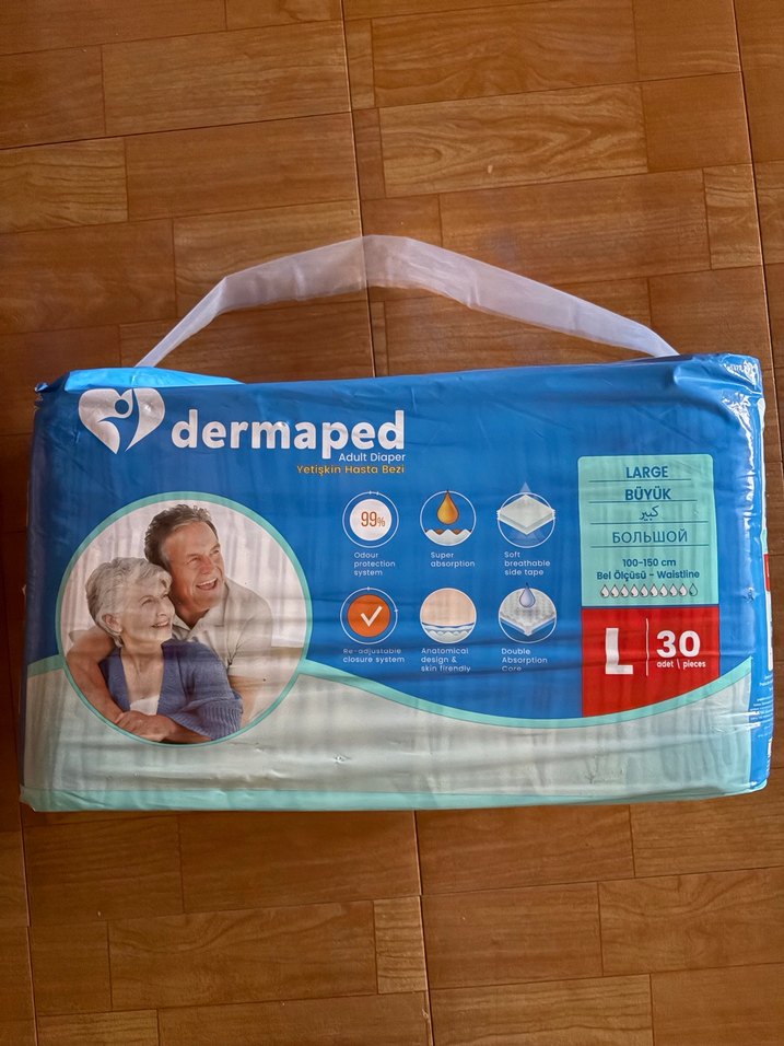 Dermaped büyük yetişkin bezi, 30 adet, 100-150 cm bel ölçüsüne uygundur. Koku kontrolü, yüksek emicilik ve nefes alabilir malzeme içerir.