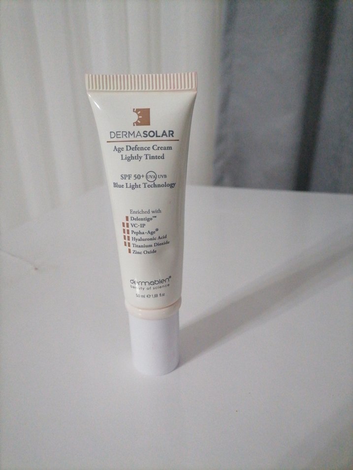 Dermasolar Age Defence Cream açık bej tonunda, SPF50+ ve mavi ışık teknolojisi ile koruma sağlar. Densilogy®, VC-IP®, peptitler ve hyaluronik asit içerir.