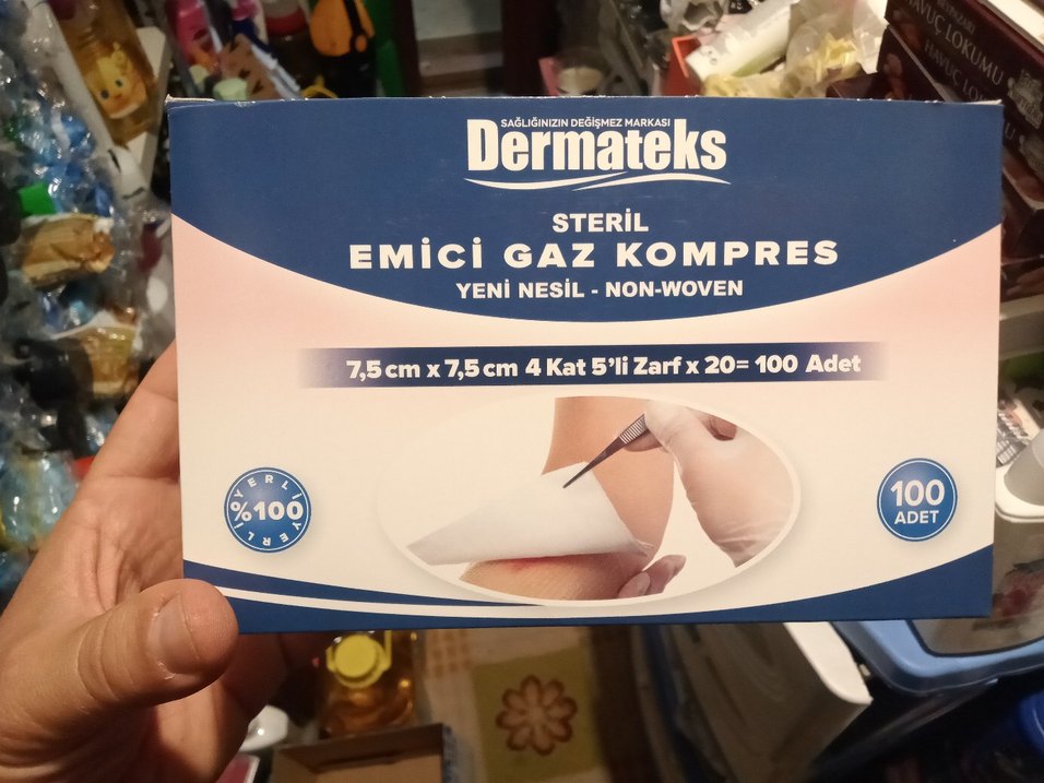 Dermateks steril emici gaz kompre, 7,5x7,5 cm boyutunda, 4 katlı, 100 adet. Yeni nesil non-woven malzeme ile etkili emicilik sağlar.