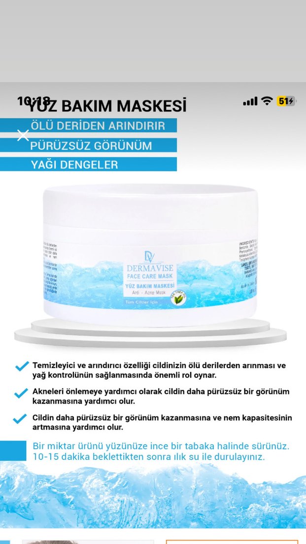 Dermavise yüz bakım maskesi, ölü derileri arındırır, yağ dengesini sağlar ve cildin pürüzsüz görünüm ile nem kapasitesini artırır. İnce tabaka halinde sürüp 10-15 dakika bekletin, sonra durulayın.