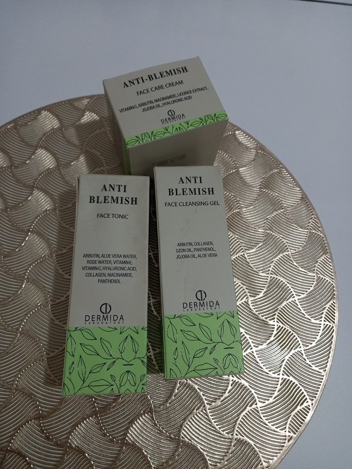 Dermida Anti-Blemish yüz bakım seti; krem, tonik ve temizleyici jelden oluşur. Arbutin, aloe vera, kolajen ve vitaminlerle formüle edilmiştir.