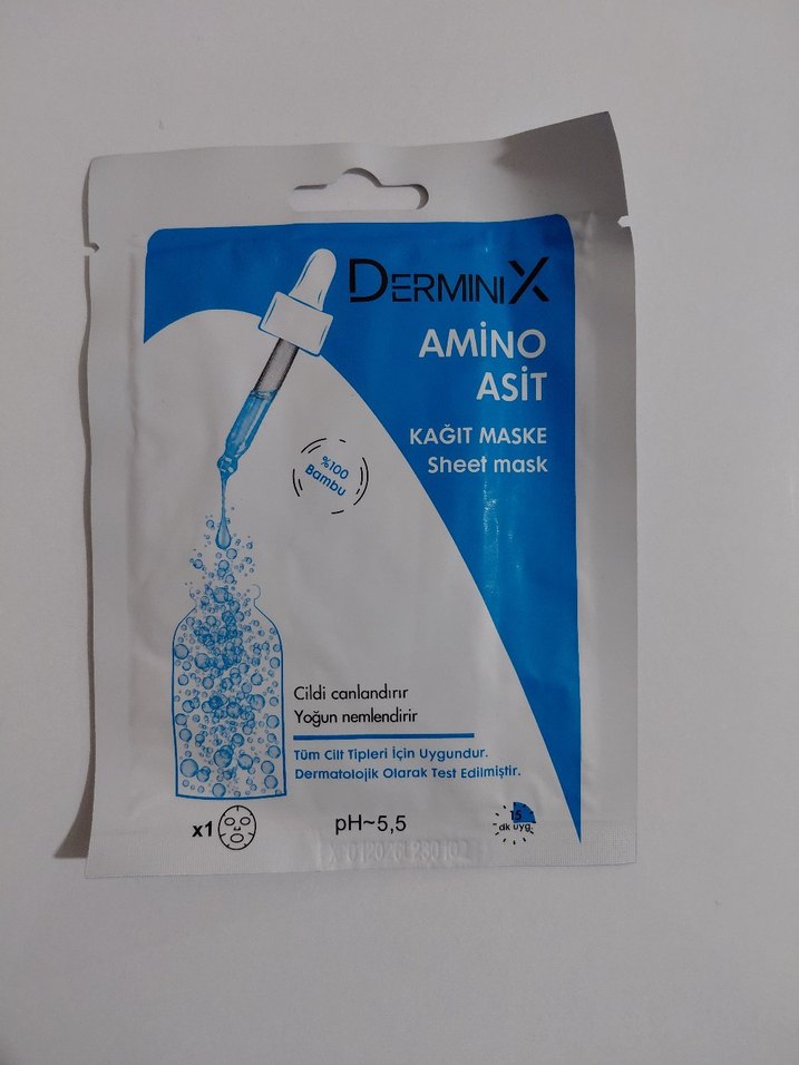 DERMINIX Amino Asit kağıt maske, cildi yoğun nemlendirir ve canlandırır. pH 5,5 ile tüm cilt tiplerine uygundur, dermatolojik olarak test edilmiştir.