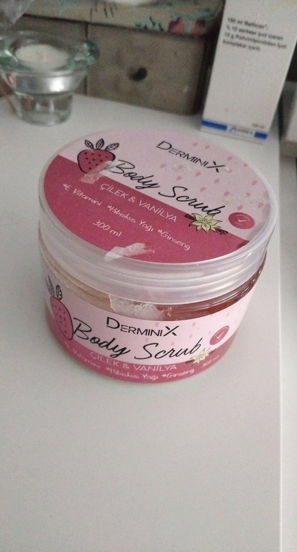 Derminix vücut peelingi, çilek ve vanilya kokusu ile vitamin E, beyaz çay yağı ve ginseng içerir. 300 ml.cildime herşeyi suremiyorum bunuda 2 kez yaptım temiz tamamı dolu