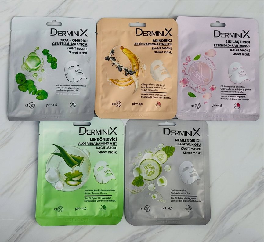Derminix pH 4.5 kağıt maskeler; nemlendirici salatalık, arındırıcı aktif karbon, onarıcı centella asiatica, leke önleyici aloe vera içerir.