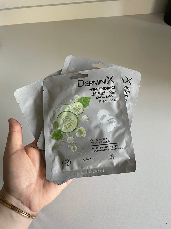 Derminix salatalık özlü kağıt maske, cildi nemlendirir ve cilt lekelerinin görünümünü azaltmaya yardımcı olur. Tüm cilt tiplerine uygundur, pH değeri 4.5'tir.