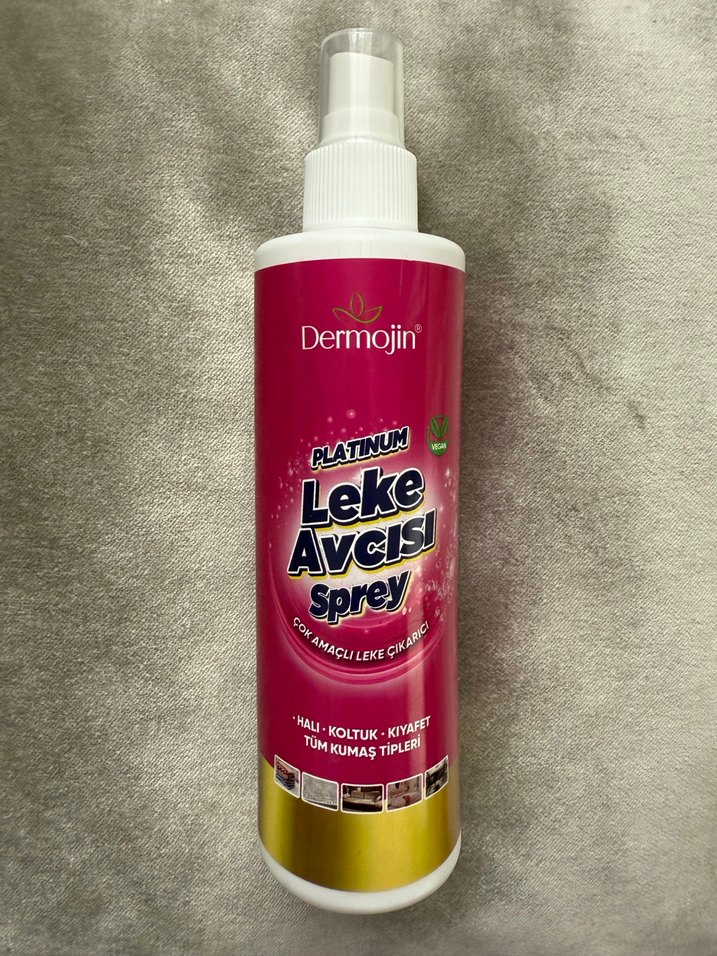 Dermojin Platinum çok amaçlı leke çıkarıcı sprey. Halı, koltuk, kıyafet ve tüm kumaş türlerinde kullanılabilir. İade yoktur iyice inceler yakalanırız hiç kullanılmadı