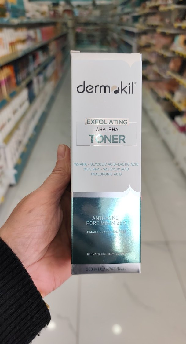 Dermokil AHA ve BHA asitleri içeren eksfoliye toner, gözenekleri küçültür ve akneye karşı etkilidir. Hyaluronik asit içerir, paraben içermez. Dermatolojik olarak test edilmiştir.