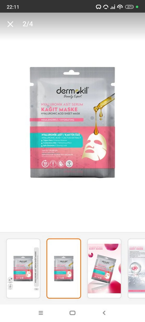Dermokil hyaluronik asit serumu ve kaktüs özü içeren nemlendirici kağıt maske. Tüm cilt tipleri için uygundur, cildi nemlendirir ve canlandırır.
