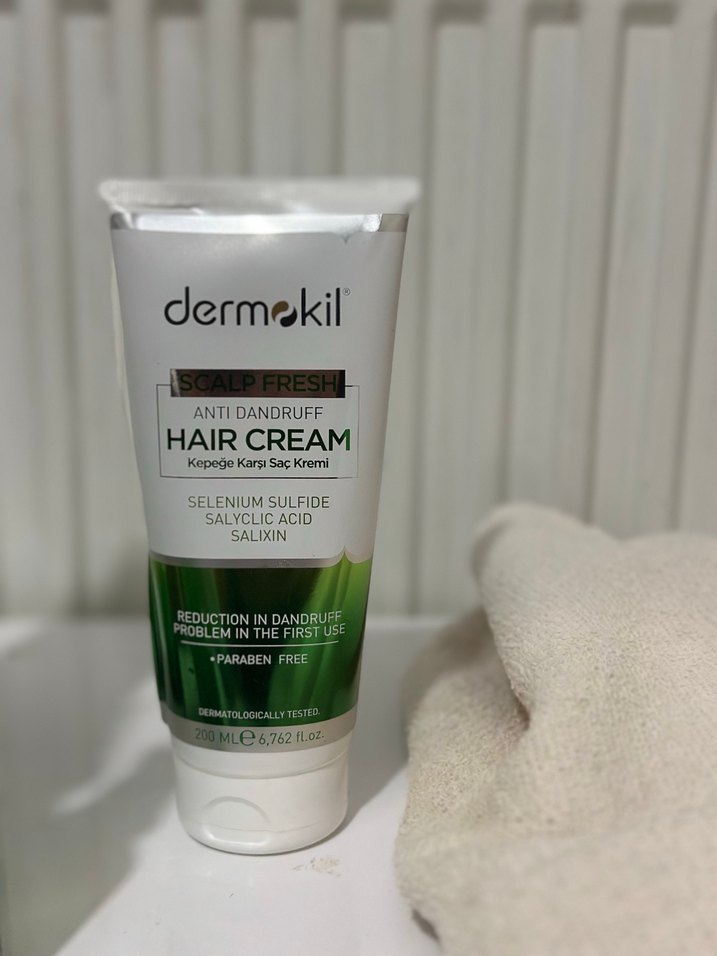 Dermokil kepek karşıtı saç kremi, selenyum sülfür, salisilik asit ve saliksin içerir. İlk kullanımdan itibaren kepek problemini azaltır. Paraben içermez.