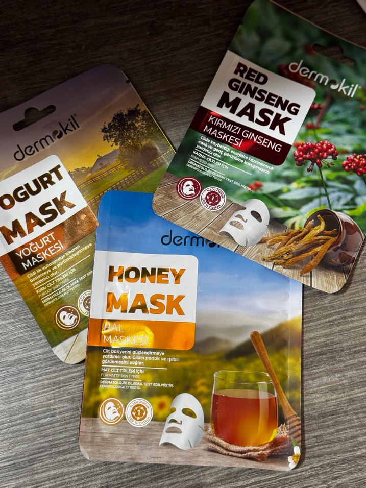 Dermokil'in Kırmızı Ginseng, Yoğurt ve Bal içerikli yüz maskeleri, cildi besleyip canlandırmaya yardımcı olur. 3 adet