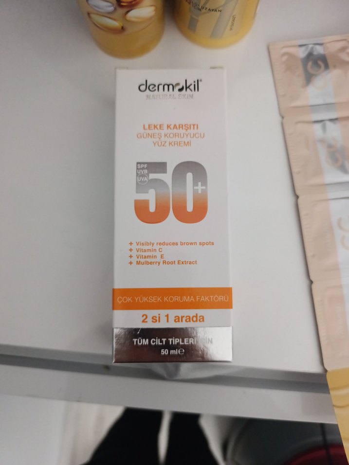 Dermokil yüz kremi, SPF 50+ çok yüksek koruma sağlar, kahverengi lekeleri azaltır ve Vitamin E ile Dut Kökü Özü içerir. Tüm cilt tipleri için uygundur. ☀️